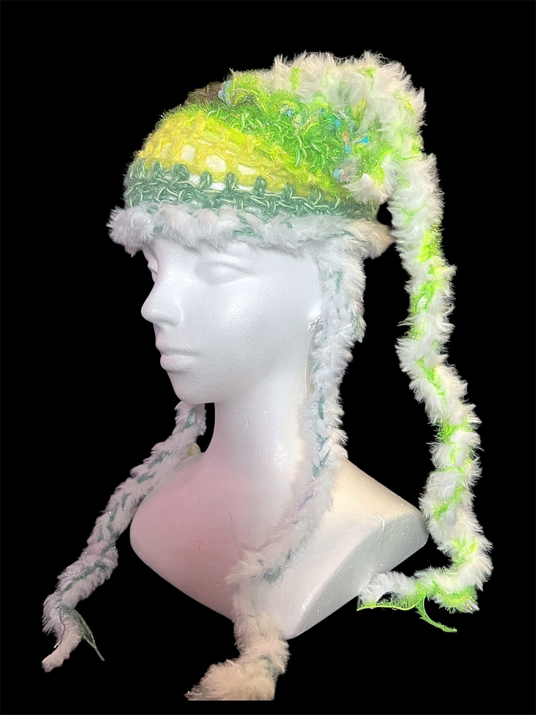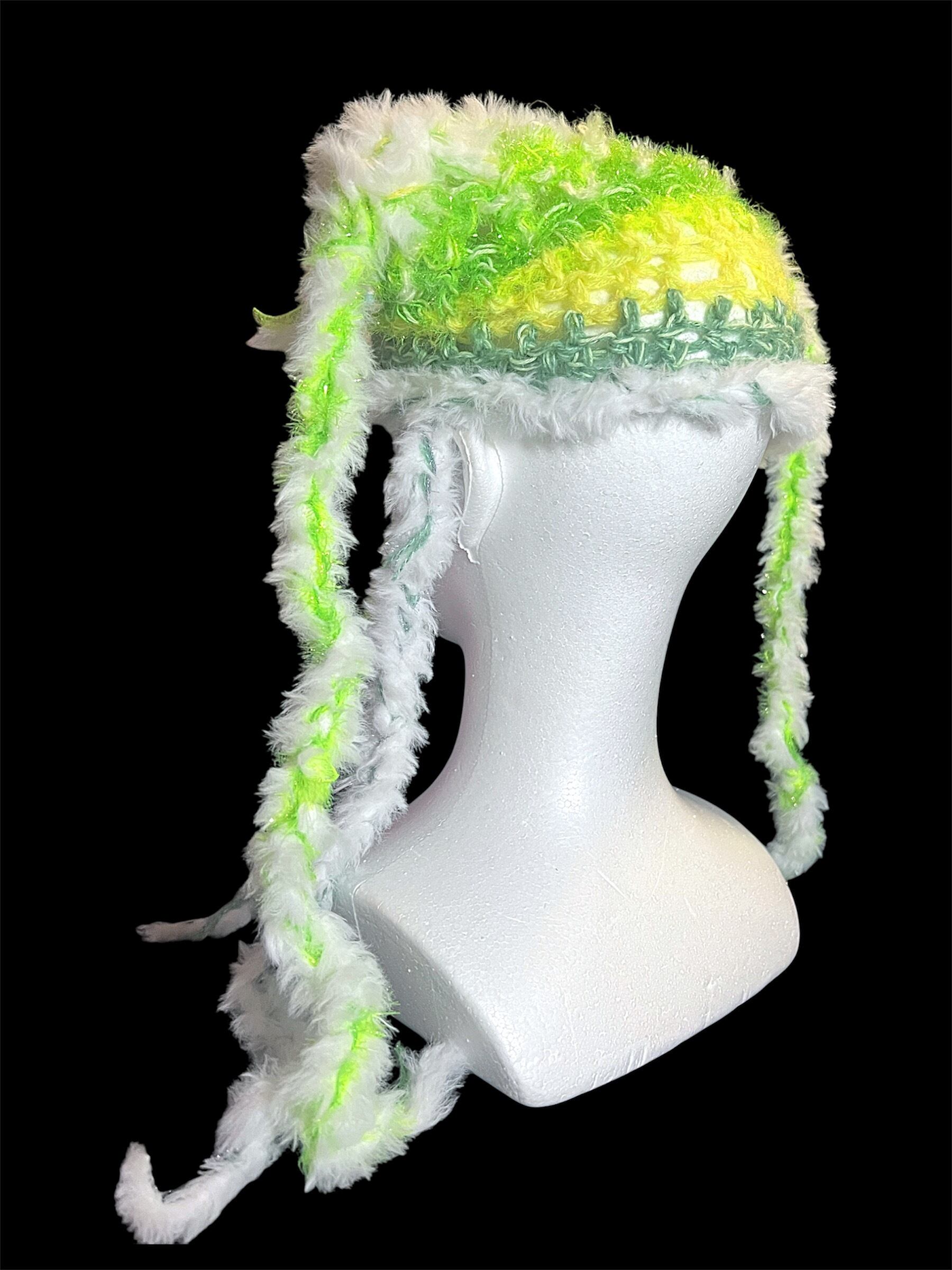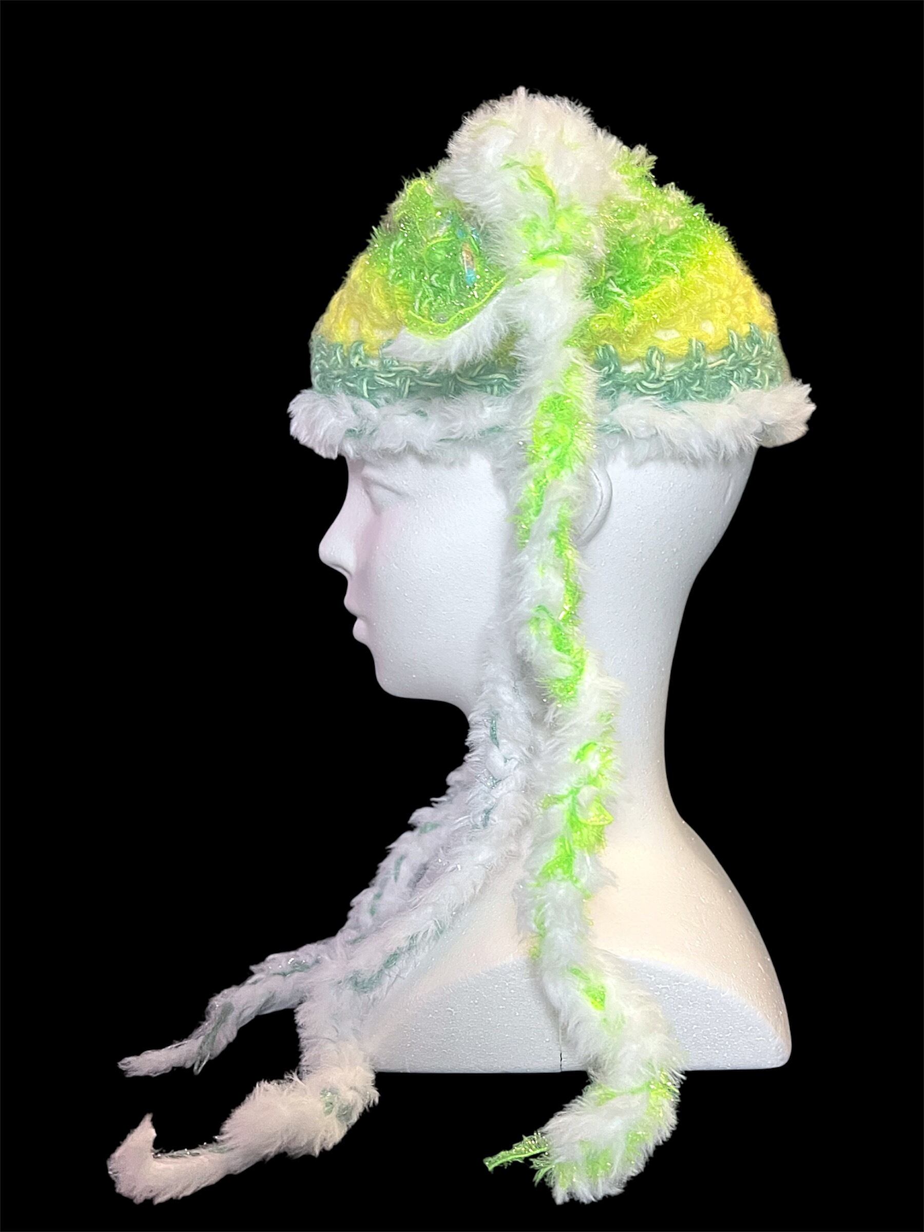 ホワイトベースにネオンカラーを編み込みました。毛足のある糸など数種類の毛糸を組み合わせた一点もののニットキャップです。
