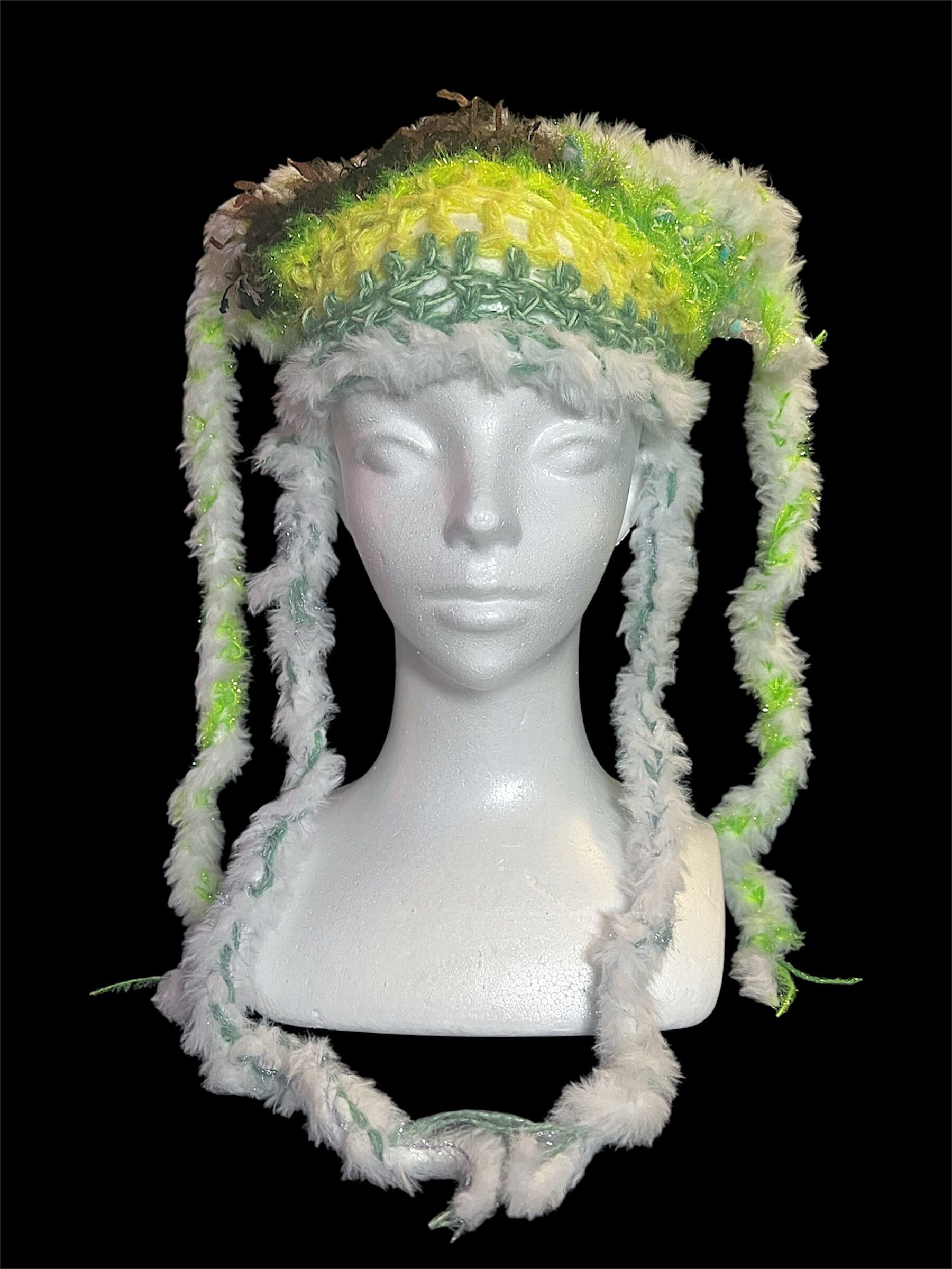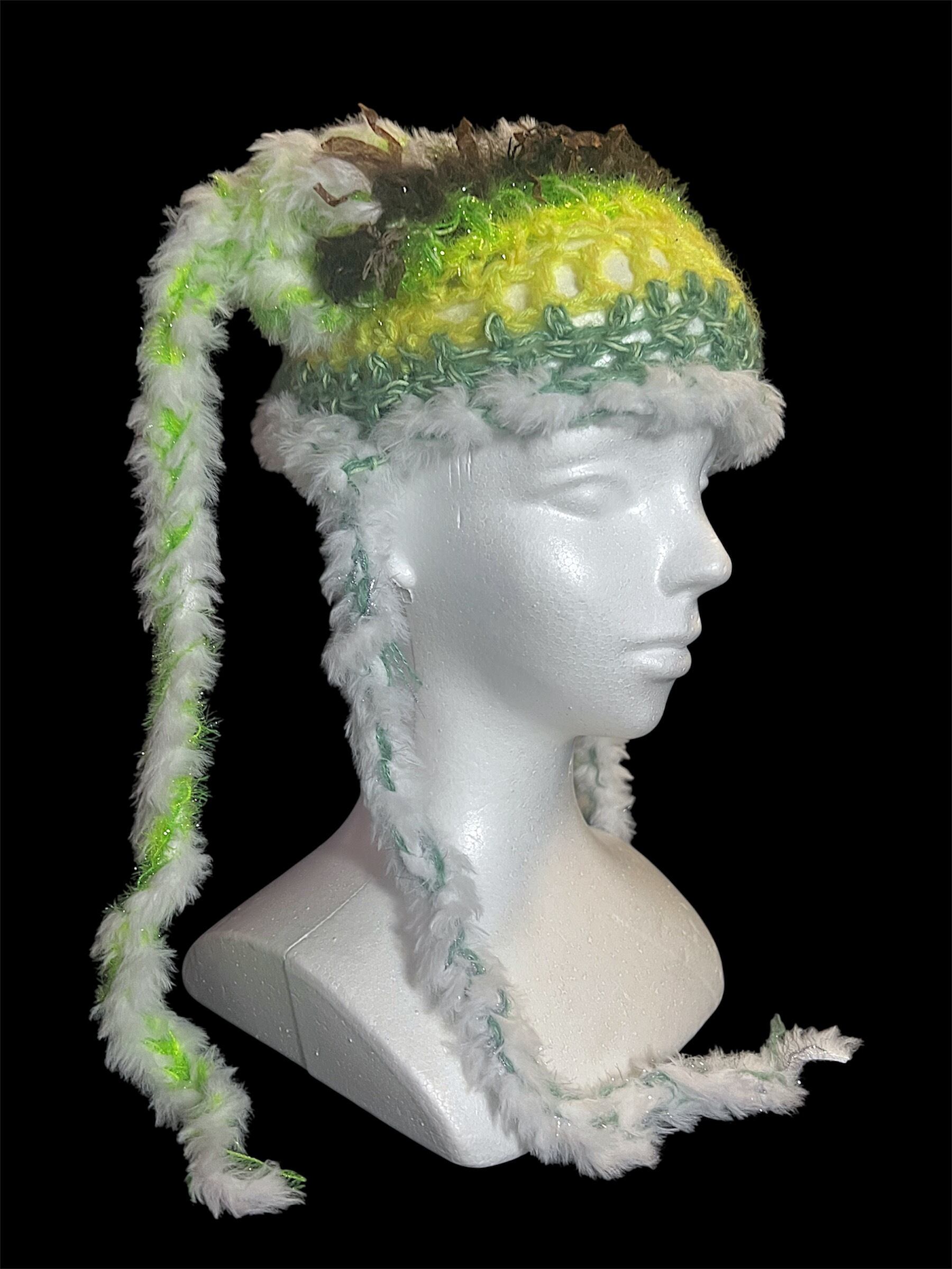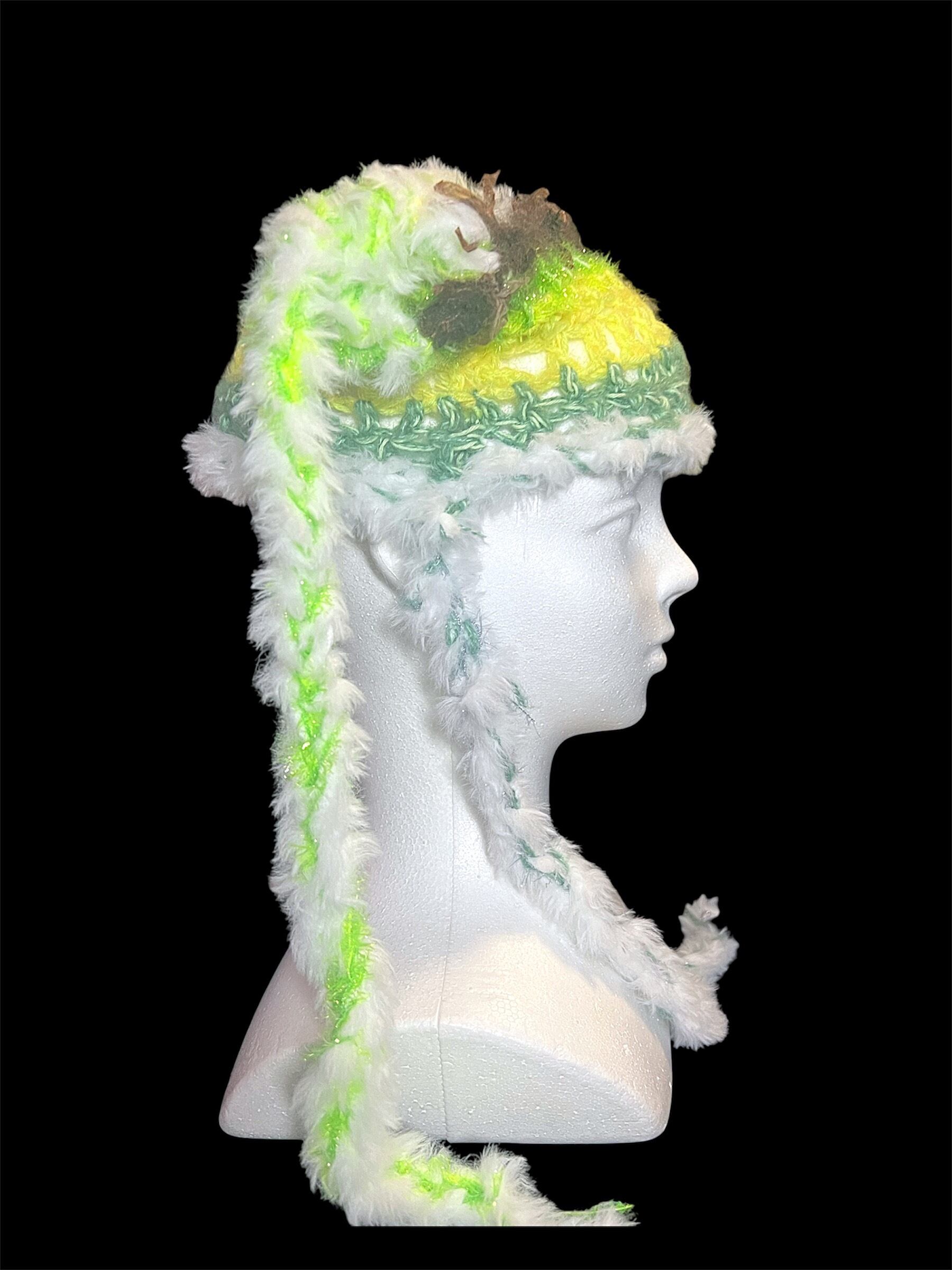 ホワイトベースにネオンカラーを編み込みました。毛足のある糸など数種類の毛糸を組み合わせた一点もののニットキャップです。
