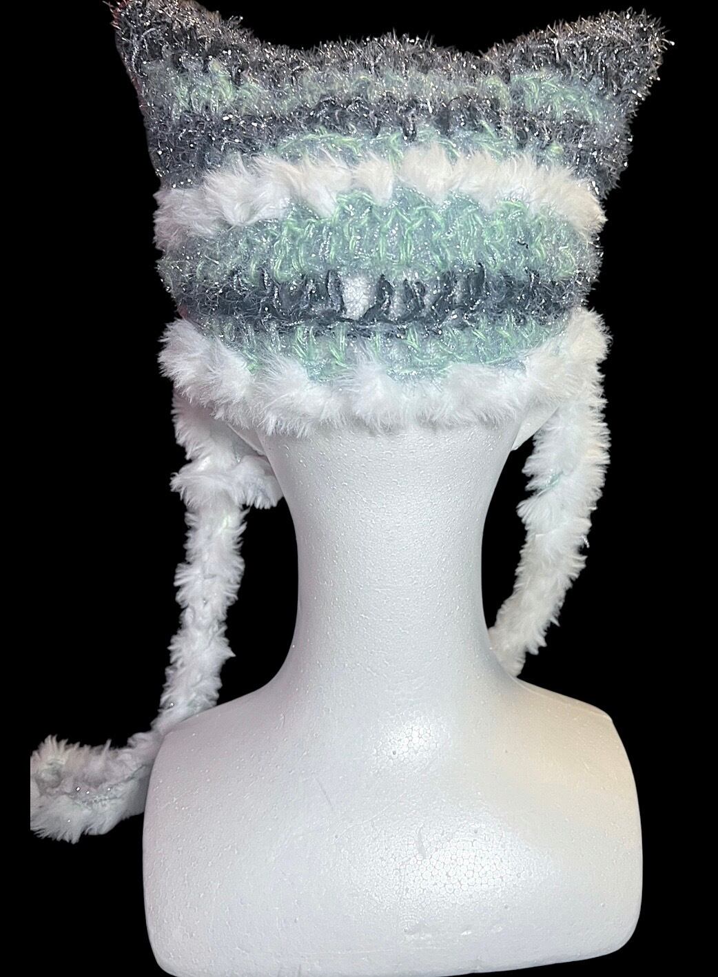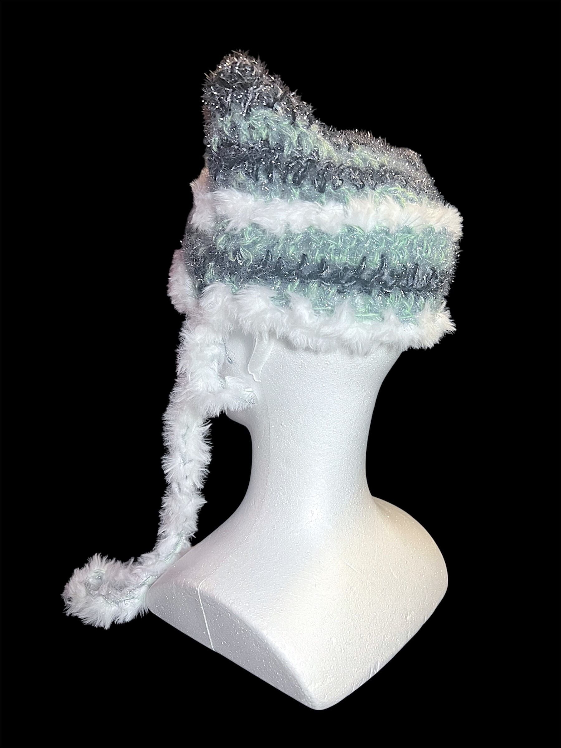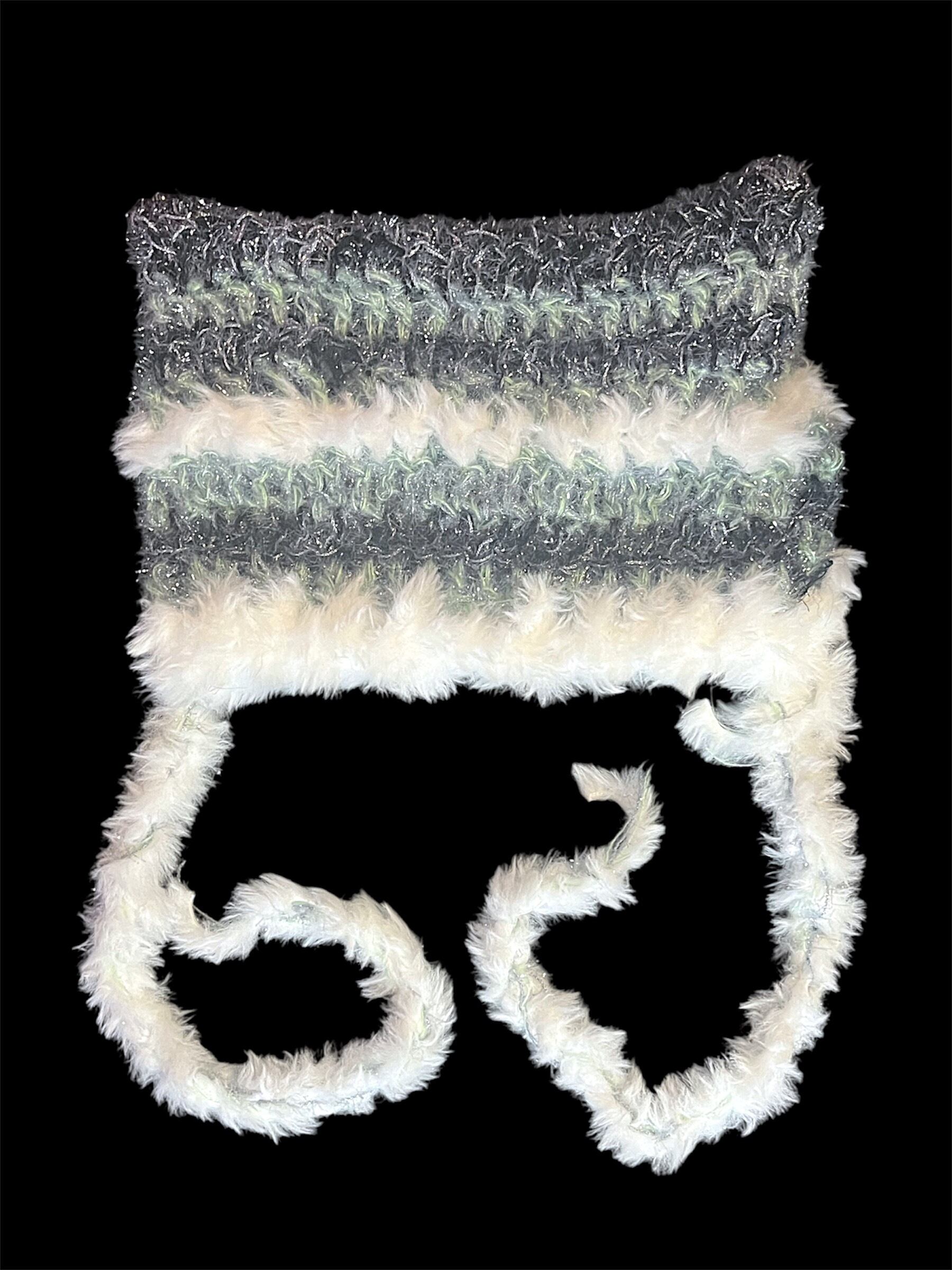 ラメ入りの糸や黒、ミント色を組み合わせたニットキャップです。冷たい質感と柔らかさが共存した仕上がり。