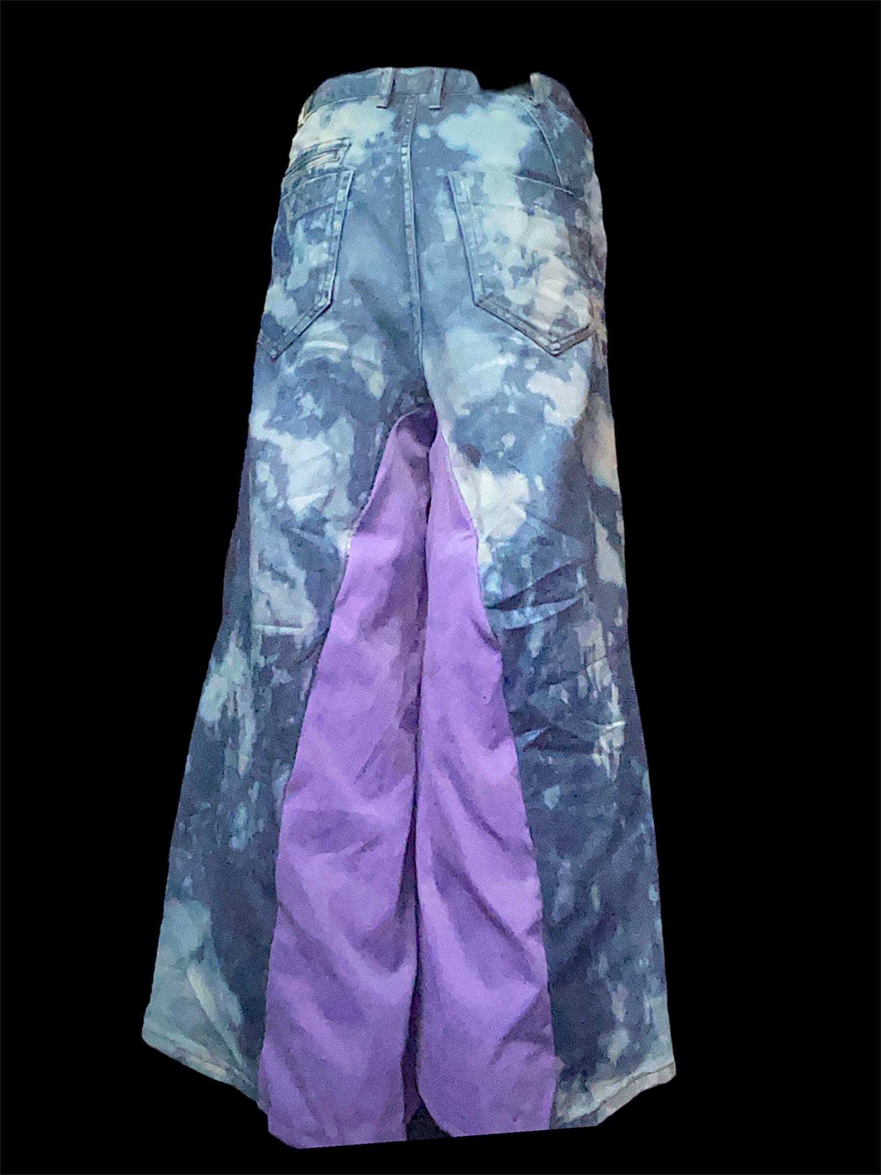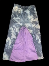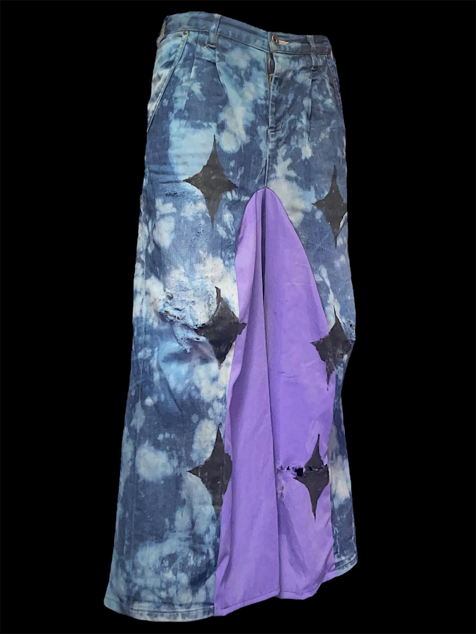 2枚のデニムを組み合わせ、ワイドシルエットのパンツにリメイク。ダメージ加工を加え、模様を作った上から青の染料で染め、星のデザインを描きました。幻想的で個性的なスタイルに仕上げた一品です。